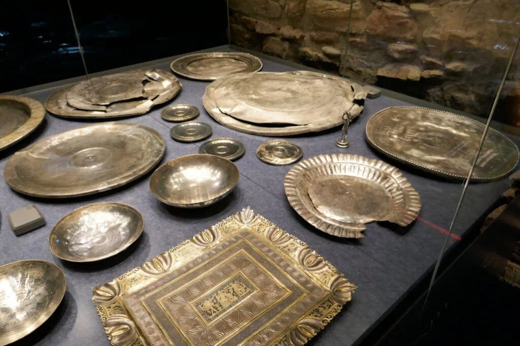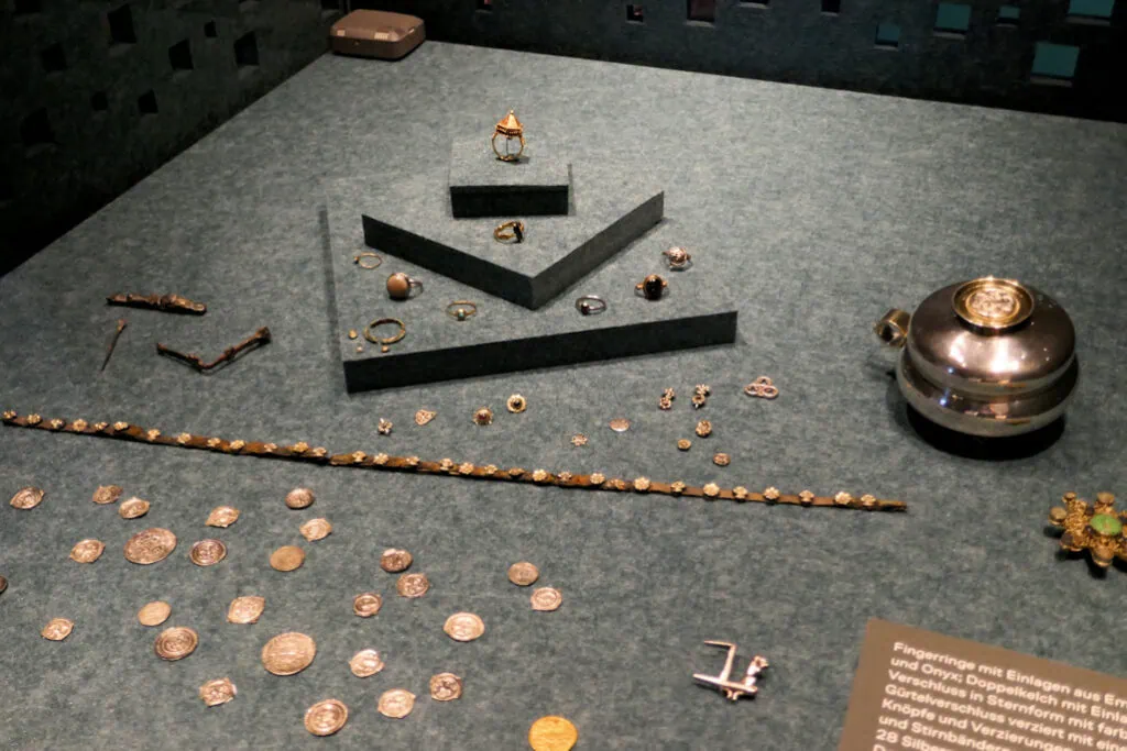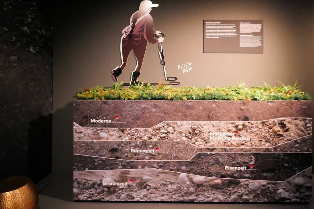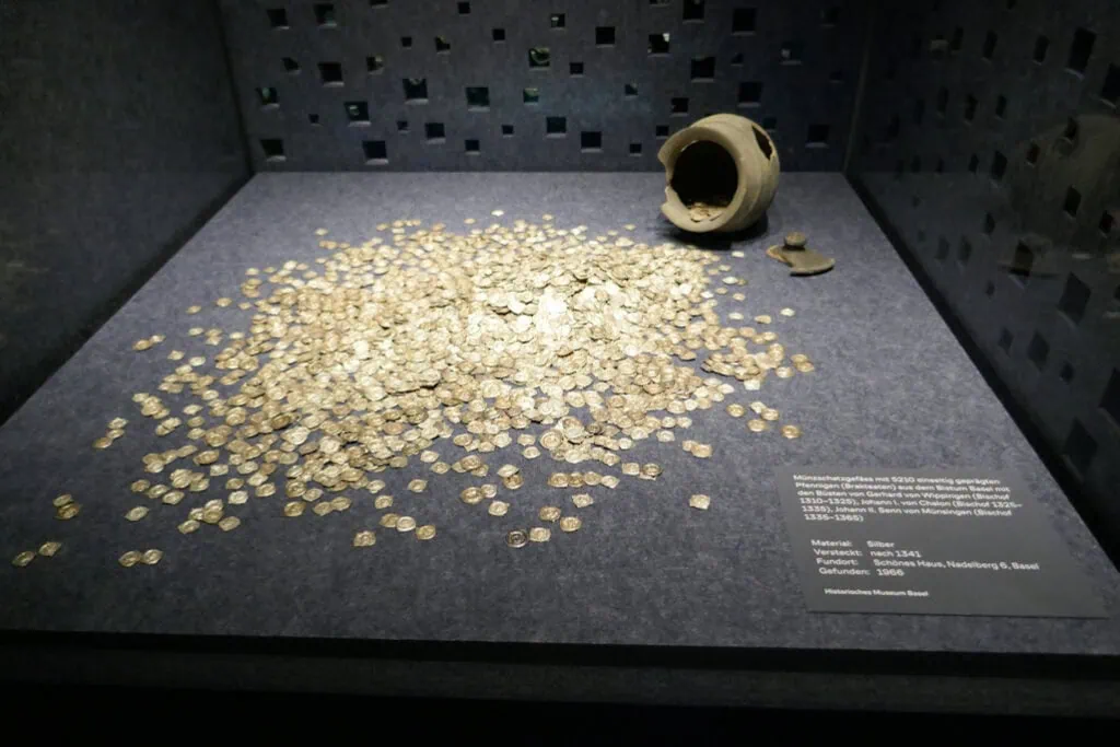 Ja, es interessiert, welche Schätze im Boden liegen! Eine Suchmethode sei hier erklärt. Diese weitere Methode ist eher nicht für Amateure geeignet. Falls du einen solchen Bistums-Münzschatz mitten in Basel findest.. oder gar Kirchenglocken in Pfeffingen, darfst du nichts davon behalten! Auch stehlen in verschiedenen Museen.. und dann versenken im Rhein-Rhône-Kanal ist kriminell. Diebe gab es schon immer, also wurde Schmuck auch in Colmar um 1349 versteckt. Auch die Kelten liessen um 100 v. Chr. schon Münzen im Boden. In Kaiseraugst fanden sich Mengen von Geschirr, Schmuck und Münzen aus reichen römischen Villen. An dieser Meerstadtplatte aus Rom um 340 n. Chr. trugen die Besitzer schwer: 5 kg Silber! Wie lange würden diese römische Delfinfigur wohl heute auf einem Brunnen stehen bleiben?